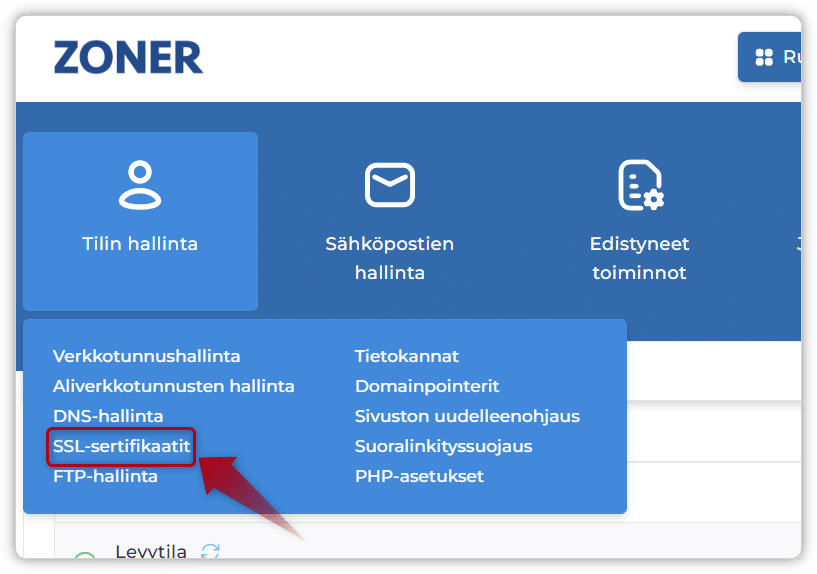 Seuraavaksi luodaan salauksen todentava sertifikaatti. Valitse päävalikosta Tilin hallinta SSL-sertifikaatit.