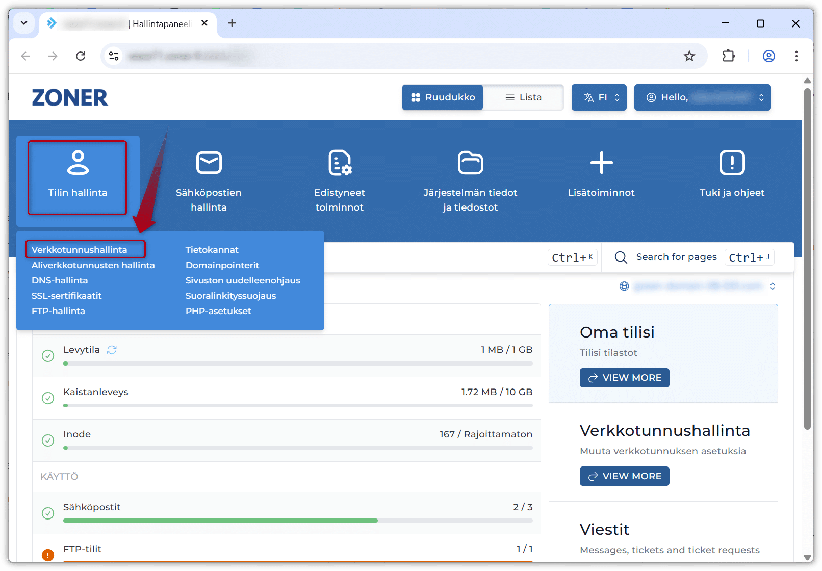 1. Kirjaudu sisään webhotellin DirectAdmin-hallintapaneeliin ja valitse päävalikosta Tilin hallintaVerkkotunnushallinta.