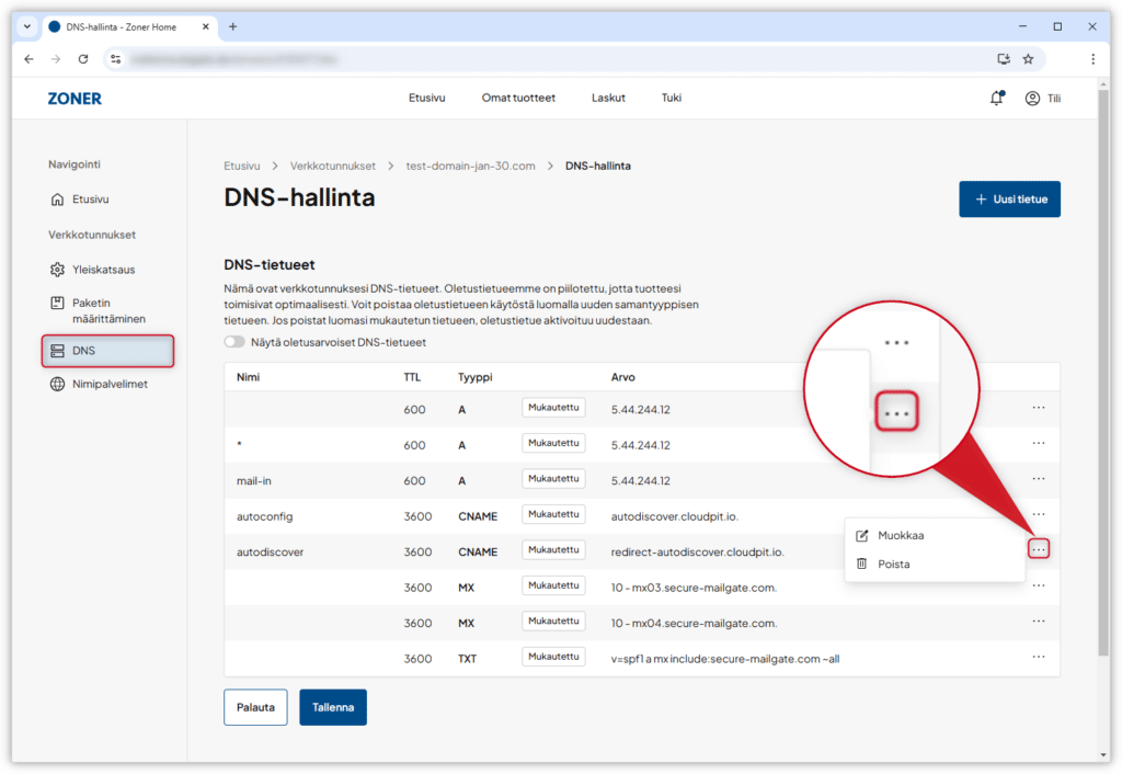 4. Napsauta vasempaan valikkoon ilmestynyttä kohtaa DNS. Näet nyt verkkotunnuksen DNS-tietueet. Voit muokata tietuetta klikkaamalla sen oikealla puolella kolmea pistettä ja valitsemalla avautuneesta valikosta Muokkaa tai Poista.