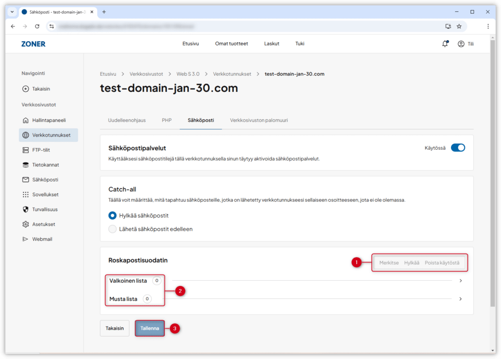 Musta lista – Mustalle listalle lisätyistä sähköpostiosoitteista tai verkkotunnuksista lähetetyt sähköpostit hylätään aina. Voit lisätä listalle kaikki tietyn verkkotunnuksen sähköpostiosoitteet tähden (*) avulla, esim. *@esimerkkiverkkotunus.fi