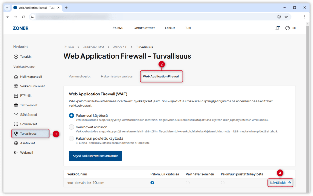 4. Klikkaa vasemmasa valikossa kohtaa Turvallisuus. Avaa Turvallisuus-sivulla Web Application Firewall -välilehti. Klikkaa Näytä lokit -painiketta sen verkkotunnuksen kohdalla, jonka lokit haluat katsoa.