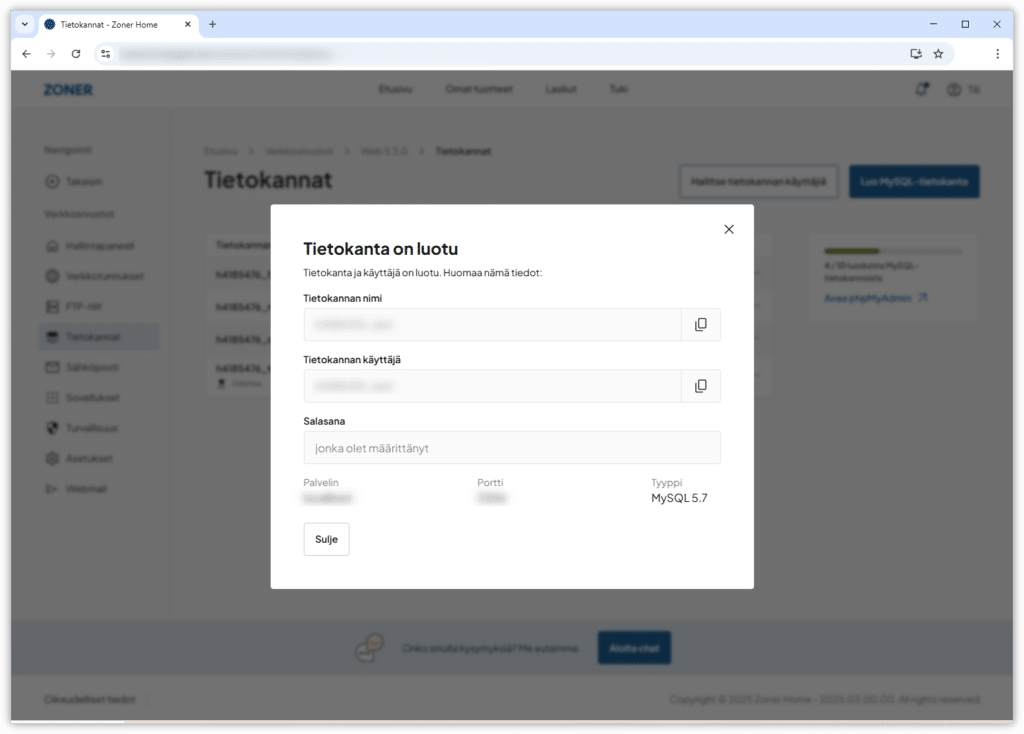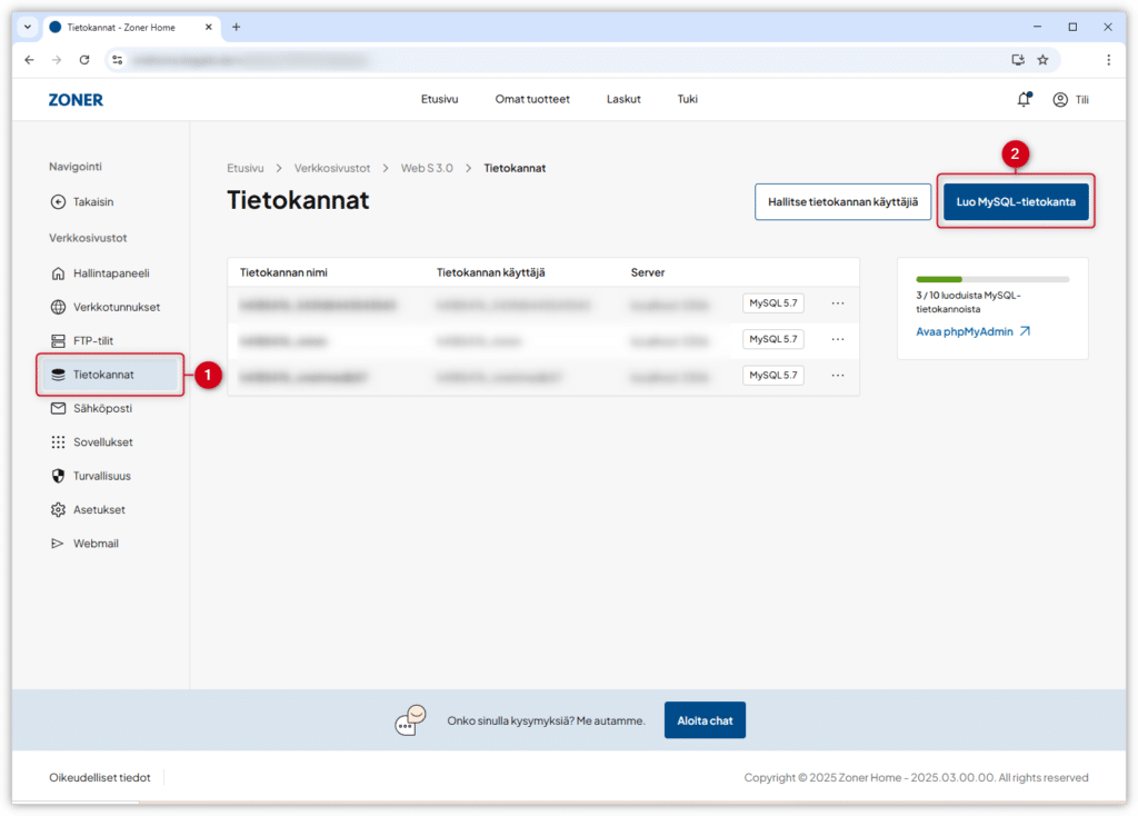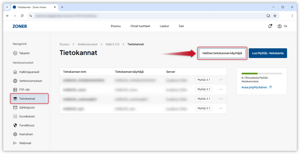 1. Kirjaudu Zoner Homeen ja avaan webhotellin Tietokannat-sivu kuten yllä vaiheissa 1-4.