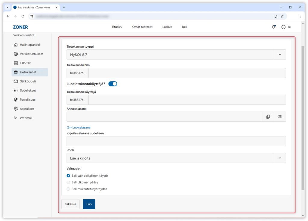 Miten luon MySQL-tietokannan Zoner Homessa?