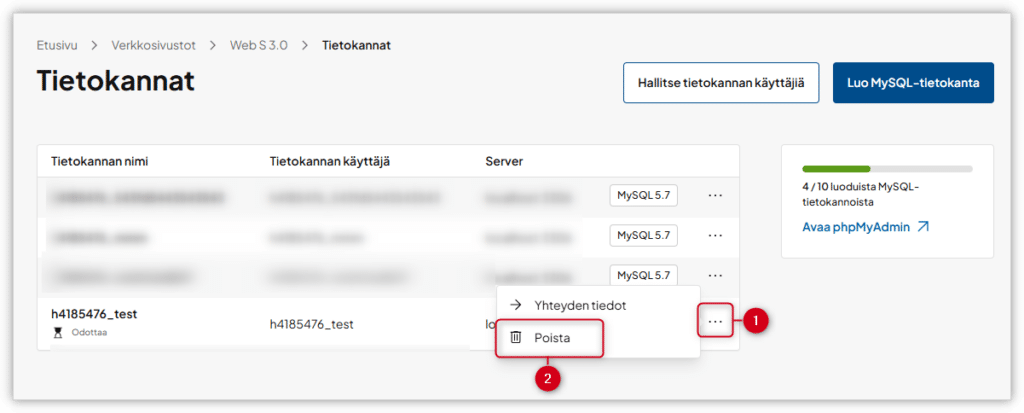 2. Klikkaa kolmea pistettä sen tietokannan kohdalla, jonka haluat poistaa. Klikkaa sitten avautuneessa valikossa Poista.