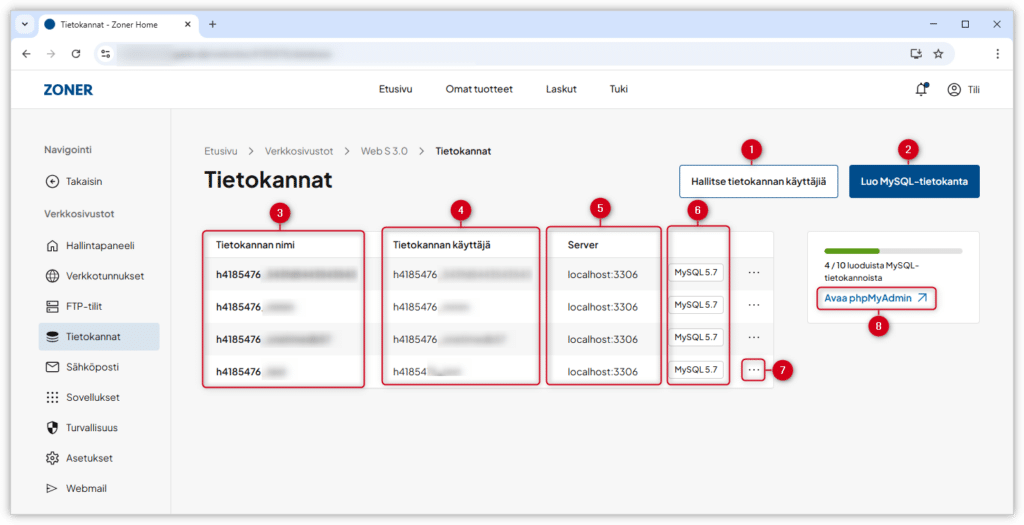 Zoner Homen Tietokannat-sivulta löydät listan webhotellin tietokannoista sekä seuraavat tiedot ja toiminnot: