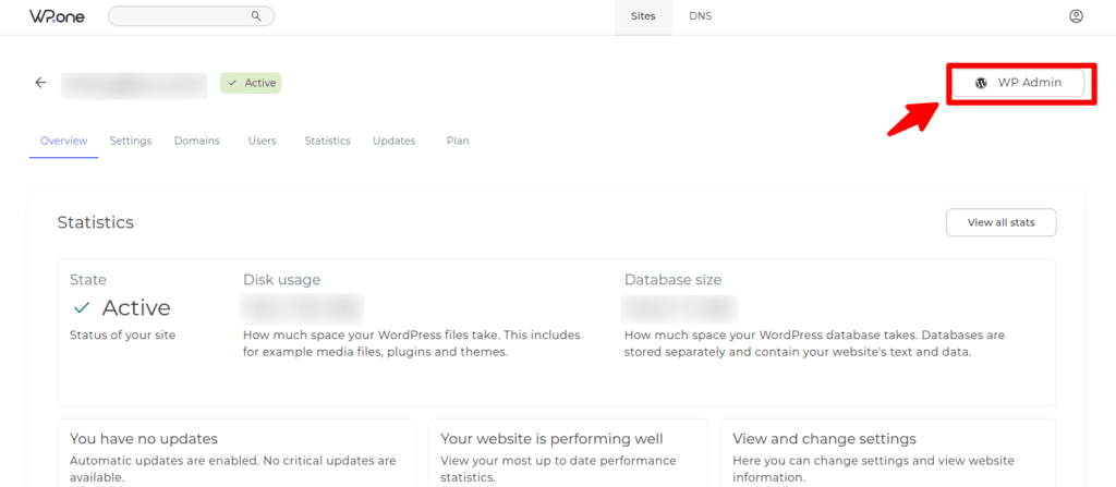 Kirjaudu sisään WordPress-hallintapaneeliisi tai siirry sinne WP Admin -painikkeen kautta osoitteessa app.wp.one: