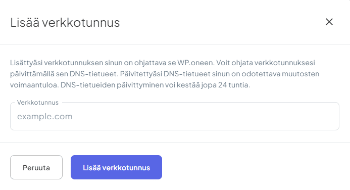 Voit lisätä WP.onessa sijaitsevalle sivustollesi lisäverkkotunnuksia. Verkkotunnusten DNS-asetukset on päivitettävä osoittamaan WP.oneen, jotta ne ohjautuvat sivustollesi.