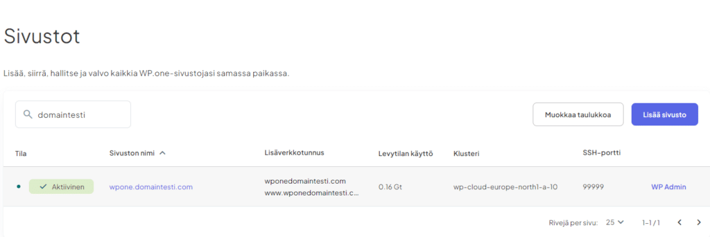 Lisää uusi sivusto WP.oneen alidomainilla näin: