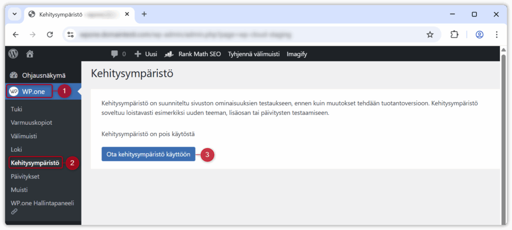 Kehitysympäristön voi ottaa käyttöön WordPress-hallintapaneelissa.