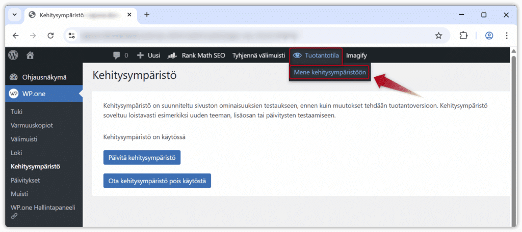 Aktivoinnin jälkeen hallintapaneelin yläosaan ilmestyy valinta Tuotantotila. Siirrä hiiren osoitin sen päälle ja klikkaa avautuneesta valikosta Mene kehitysympäristöön.