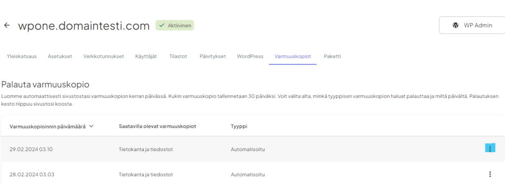 WP.one-palvelussa sivustosi turvataan päivittäisillä automaattisilla varmuuskopioilla. Jos sivustollasi ilmenee ongelmia, voit aina korjata ne palauttamalla aikaisemman varmuuskopion. Jokaista varmuuskopiota säilytetään 30 päivää. Voit ladata ja palauttaa varmuuskopioita WP.one-hallintapaneelissasi.
