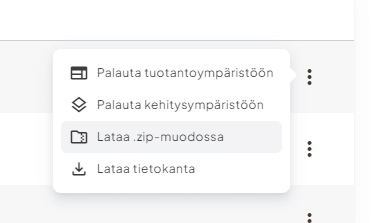 - Valitse, haluatko palauttaa varmuuskopion tuotantoympäristöön (eli varsinaiselle sivustollesi), kehitysympäristöön vai ladata sen laitteellesi: