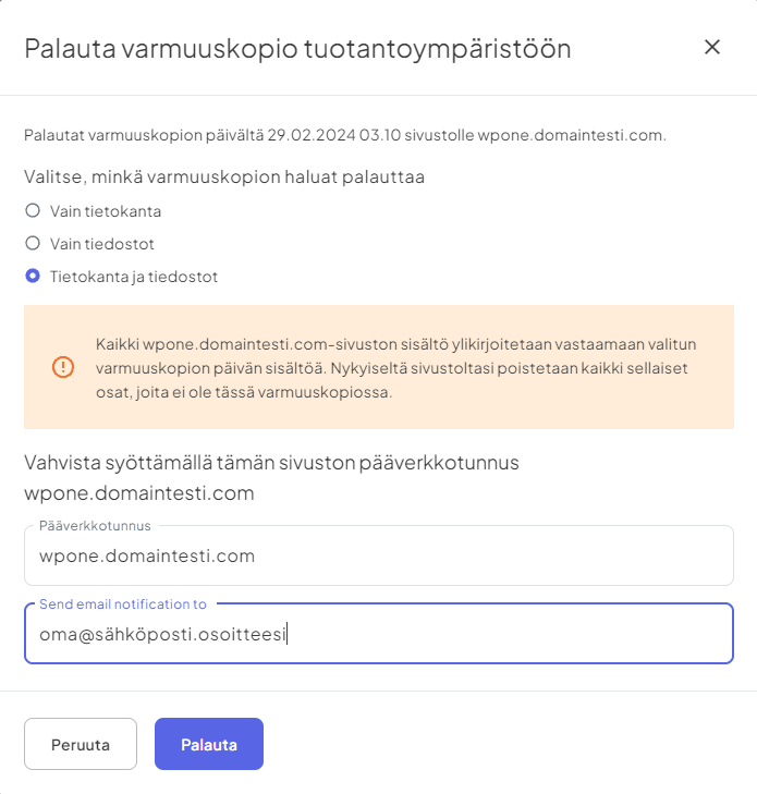 - Valitse ponnahdusikkunasta, haluatko palauttaa tietokannan, tiedostot vai kummatkin. Huomaa, että kaikki valitsemasi tiedot ylikirjoitetaan varmuuskopion sisältämillä tiedoilla. Vahvista palautus kirjoittamalla sivustosi pääverkkotunnus ja klikkaamalla Palauta: