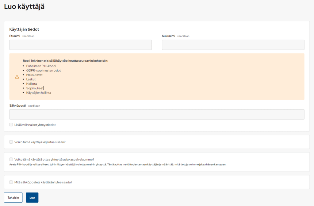 • Voiko tämä käyttäjä ottaa yhteyttä asiakaspalveluumme? Aseta PIN-koodi ja valitse aiheet, joihin liittyen käyttäjä voi ottaa meihin yhteyttä. Valittavat aiheet ovat ylläpito, tekninen ja laskutus.