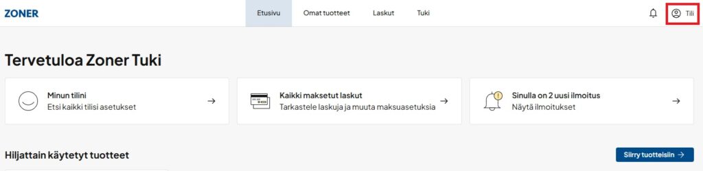 2. Klikkaa etusivun oikeasta yläkulmasta löytyvää ”Tili” -painiketta.