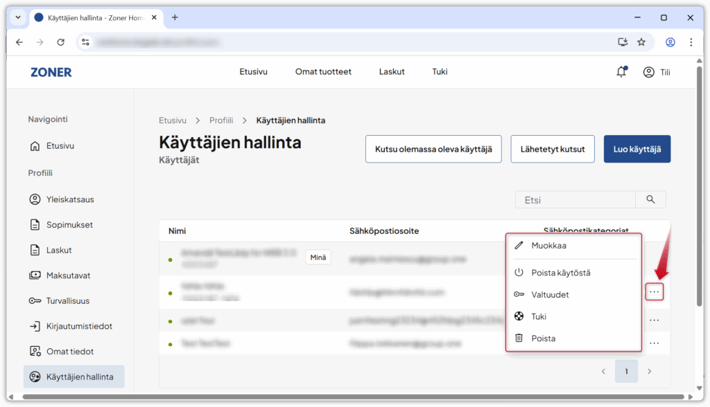 Käyttäjien hallinta -sivulla näet kaikki tilin käyttäjät. Klikkaamalla kolmea pistettä rivin oikeassa reunassa voit avata käyttäjän asetukset: