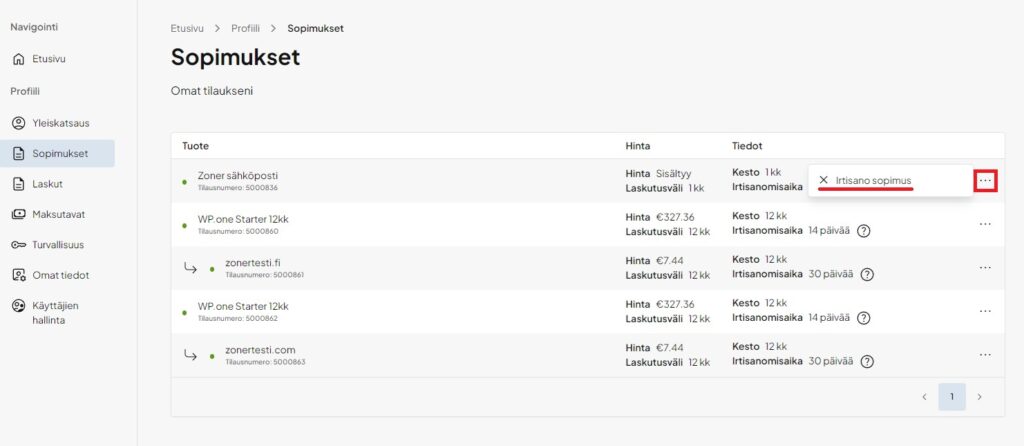 4. Valitse sopimus, jonka haluat irtisanoa, ja valitse sen kohdalta Irtisano sopimus.