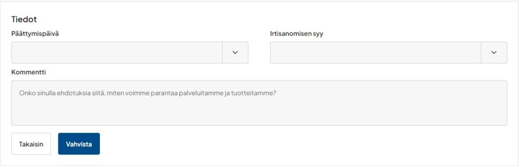 Täytettyäsi kentät voit vahvistaa irtisanomisen napsauttamalla Vahvista-painiketta.