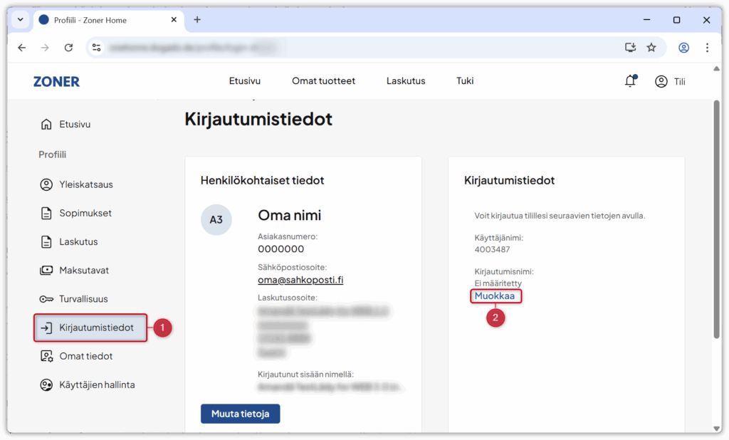 2. Klikkaa vasemmassa valikossa Kirjautumistiedot ja sen jälkeen ”Kirjautumisnimi”-kohdan alla Muokkaa.