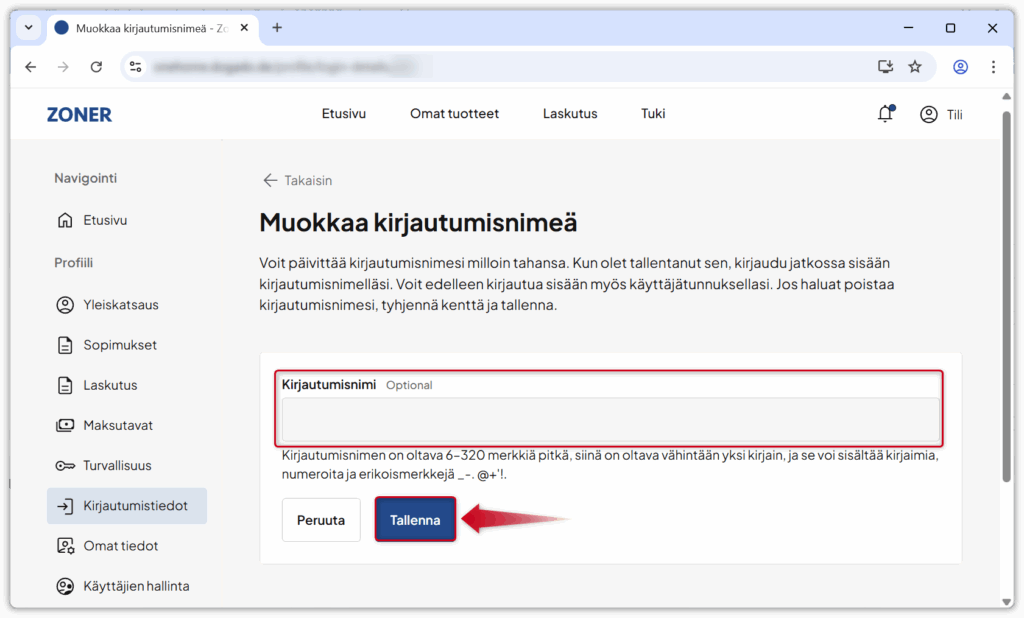3. Kirjoita kenttään haluamasi kirjautumisnimi, esim. sähköpostiosoitteesi, ja klikkaa sen jälkeen Tallenna.