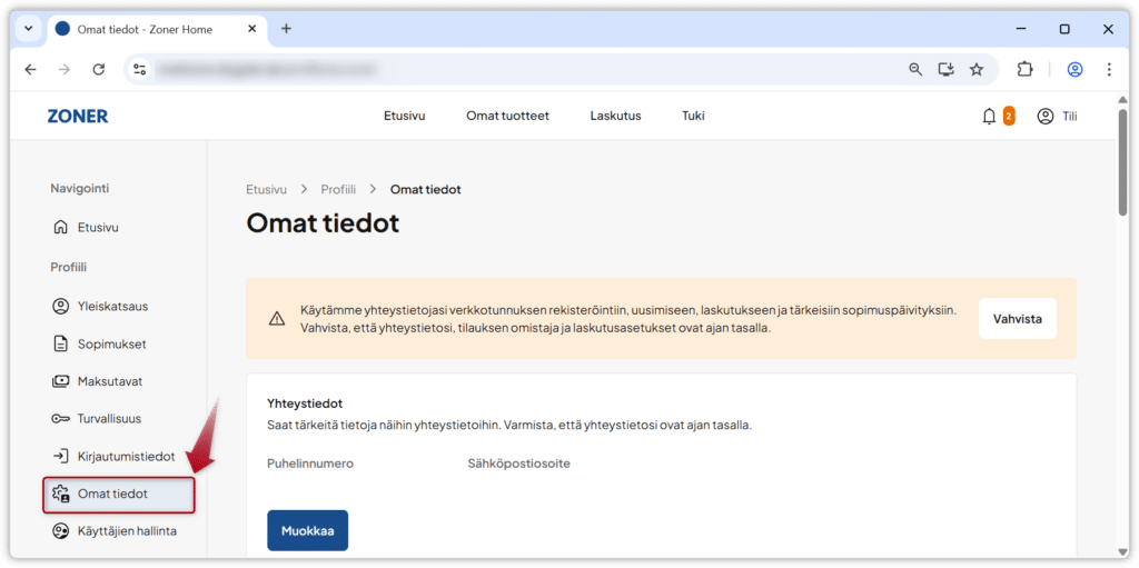 3. Klikkaa vasemmassa valikossa Omat tiedot.