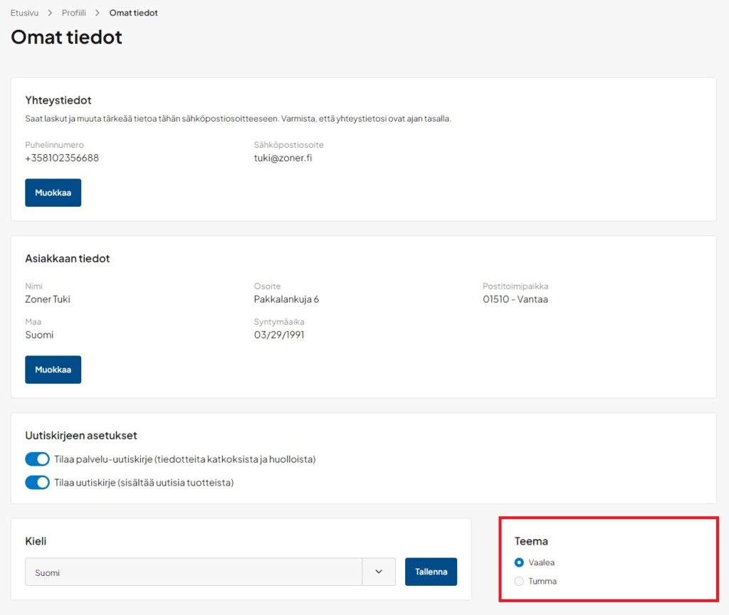 Teeman valinta on käyttäjäkohtainen, eli jokainen käyttäjä voi itse valita käyttämänsä teeman. Valinta säilyy selainten ja laitteiden välillä.