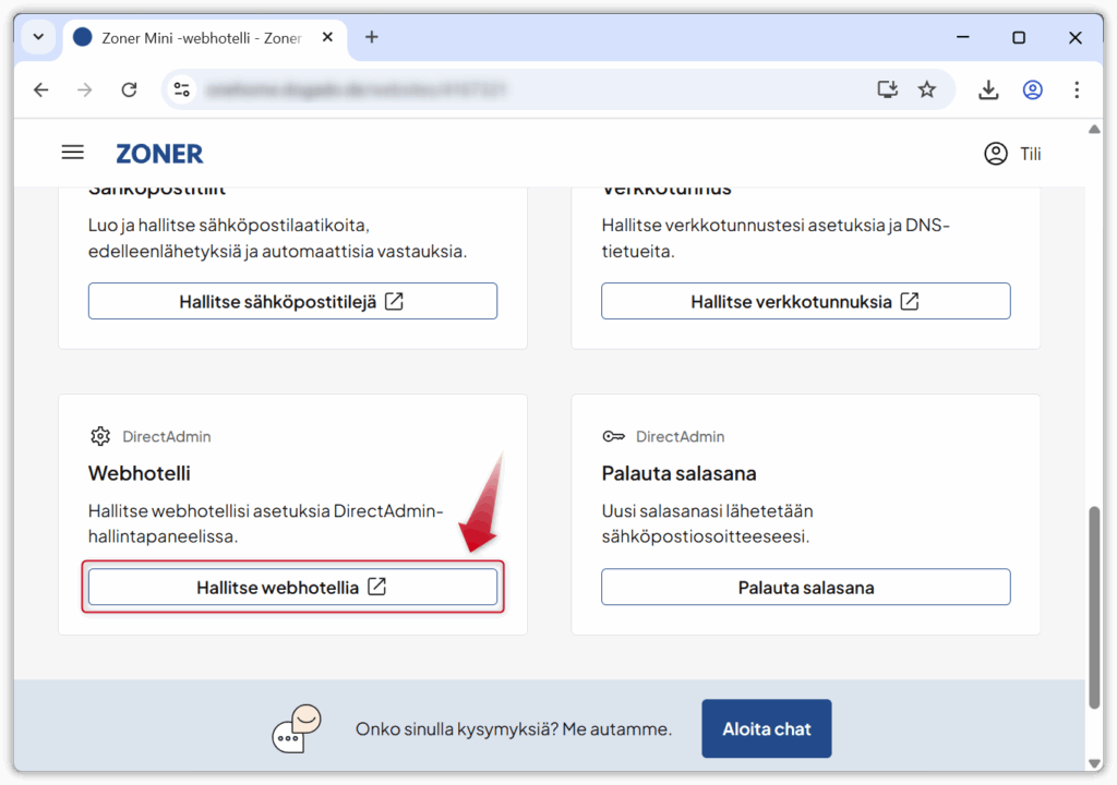 3. Vieritä alemmas ja klikkaa Hallitse webhotellia -linkkiä, niin pääset webhotellin DirectAdmin-hallintapaneeliin. DirectAdmin-ohjeet löytyvät Tukisivuston Webhotelli->DirectAdmin-kategoriasta.