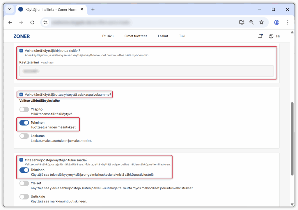 Lisäksi ”Voiko tämä käyttäjä ottaa yhteyttä asiakaspalveluumme” ja ”Mitä sähköposteja käyttäjän tulee saada” -kohdissa kannatta valita Tekninen.