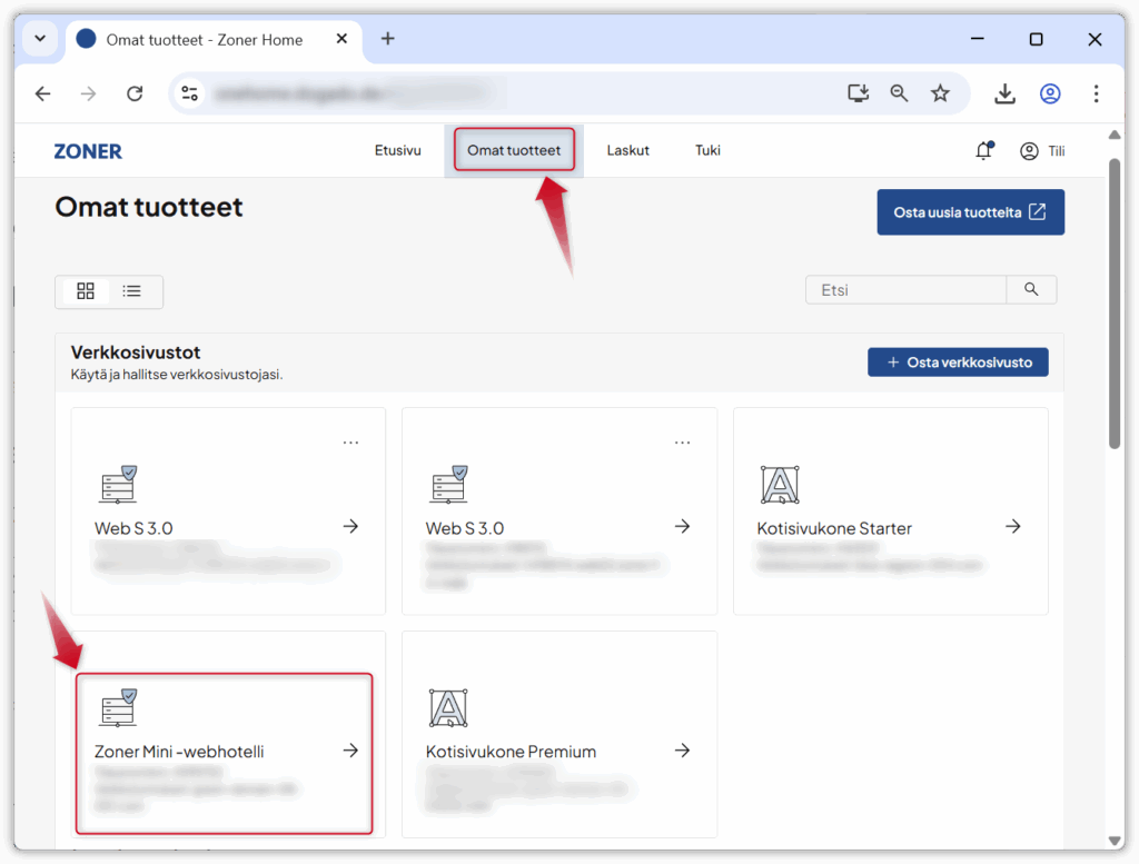 Tuotteiden tarkastelu – Zoner Homen yläreunan Omat tuotteet -välilehdellä näet tilin tuotteet. Klikkaamalla webhotellia pääset sen yleiskatsaukseen, josta löytyvällä painikkeella voit siirtyä webhotellin hallintapaneeliin.