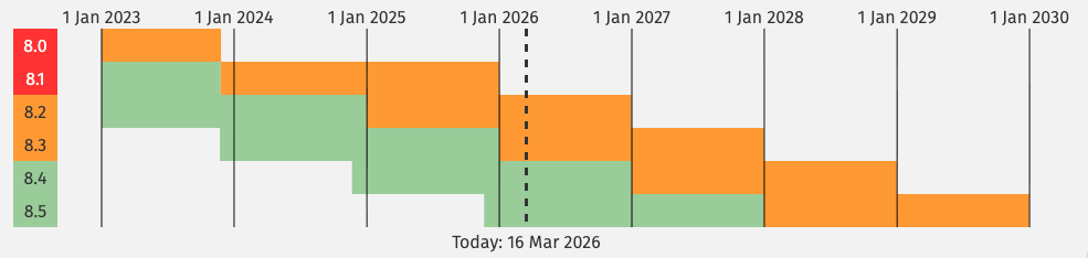 PHP versio 8.1 julkaistiin 25.11.2022, ja se on viimeisin versio, jota ei enää tueta 31.12.2025 lähtien. Eli tällä hetkellä vanhentuneita PHP-versioita ovat versio 8.1 ja sitä vanhemmat.