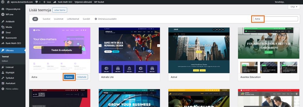 Paina valitsemasi teeman kohdalla Asenna. Odota hetki, että asennus valmistuu, ja paina sen jälkeen samaan kohtaan ilmestynyttä Ota käyttöön -painiketta. Katso yksityiskohtainen ohje WordPress-teeman asentamiseen.