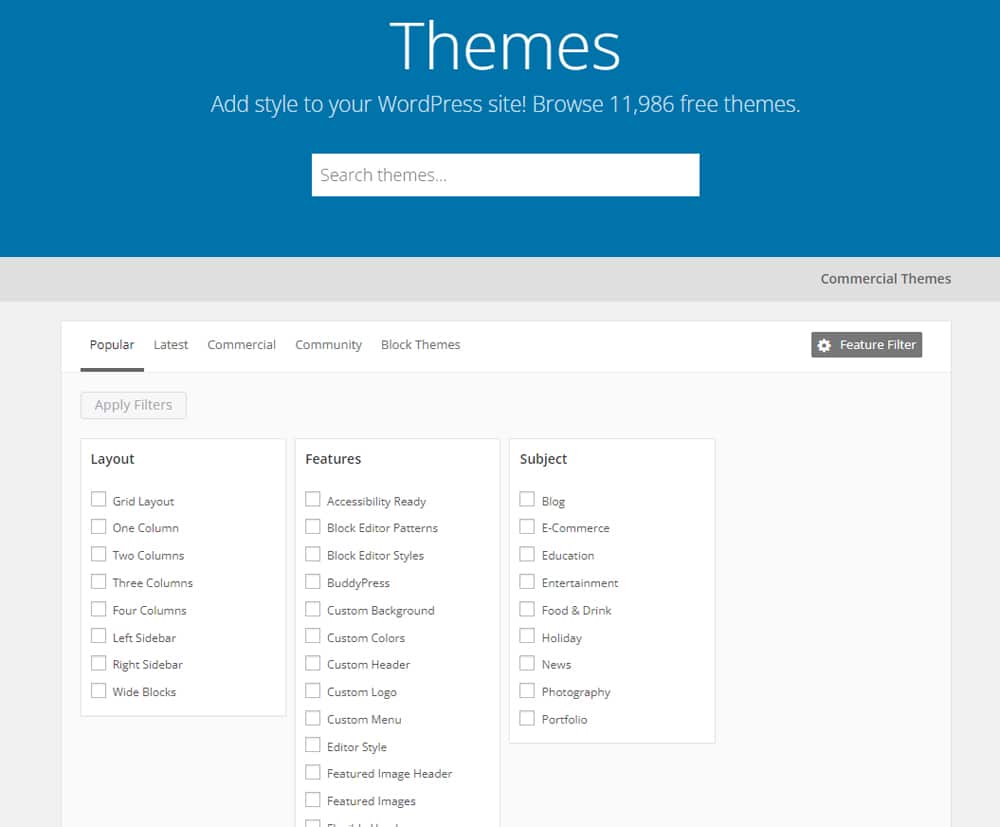 Teemoja on saatavilla tuhansia erilaisia, ja voit hakea niitä WordPress­-teemahakemistosta. Löydät teemahakemiston myös suoraan WordPress-hallintapaneelistasi kohdasta Ulkoasu -> Teemat -> Lisää uusi teema.
